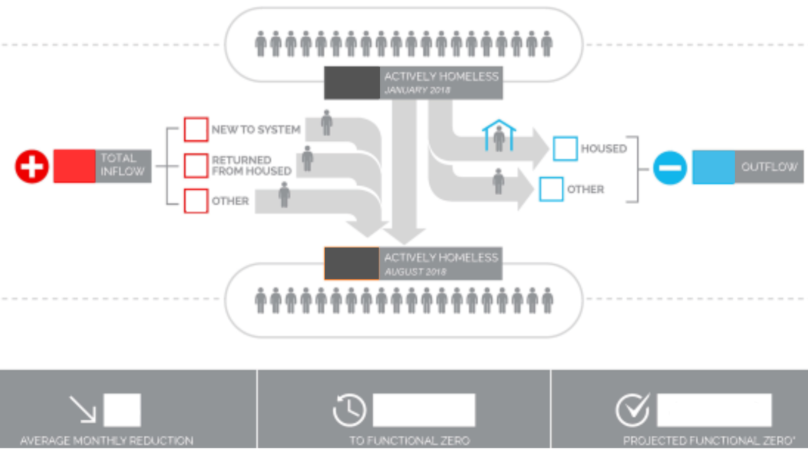 The actual number of people living outside reflects the entire homelessness to housing (H2H) continuum, including the number of people becoming homeless (inflow) and those leaving homelessness (outflow), as well as those living on the streets and in shelters. The number allows the County to use real information to drive change, assess progress, course-correct, and promote meaningful outcomes.